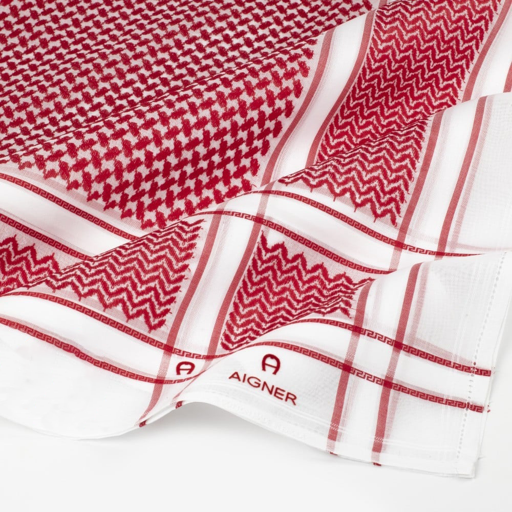 • يتميز الشماغ بتدرجات اللون الأحمر الداكن الممزوج بألوان دم الغزال، ليضيف لمسة من الفخامة.