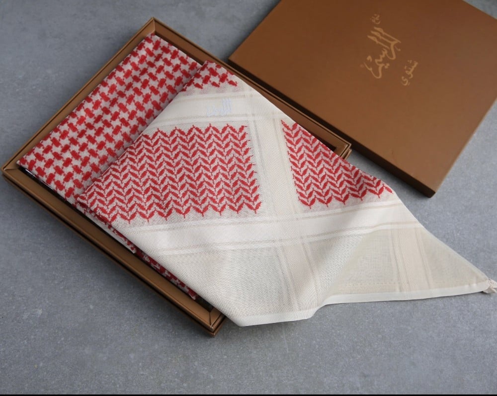 شماغ المراسيم أحمر وبيج شبابي جديدا فى كل مرة يتم ارتداءه بها حيث الجودة العالية واللمعه المتفردة التي لا تختفي .
