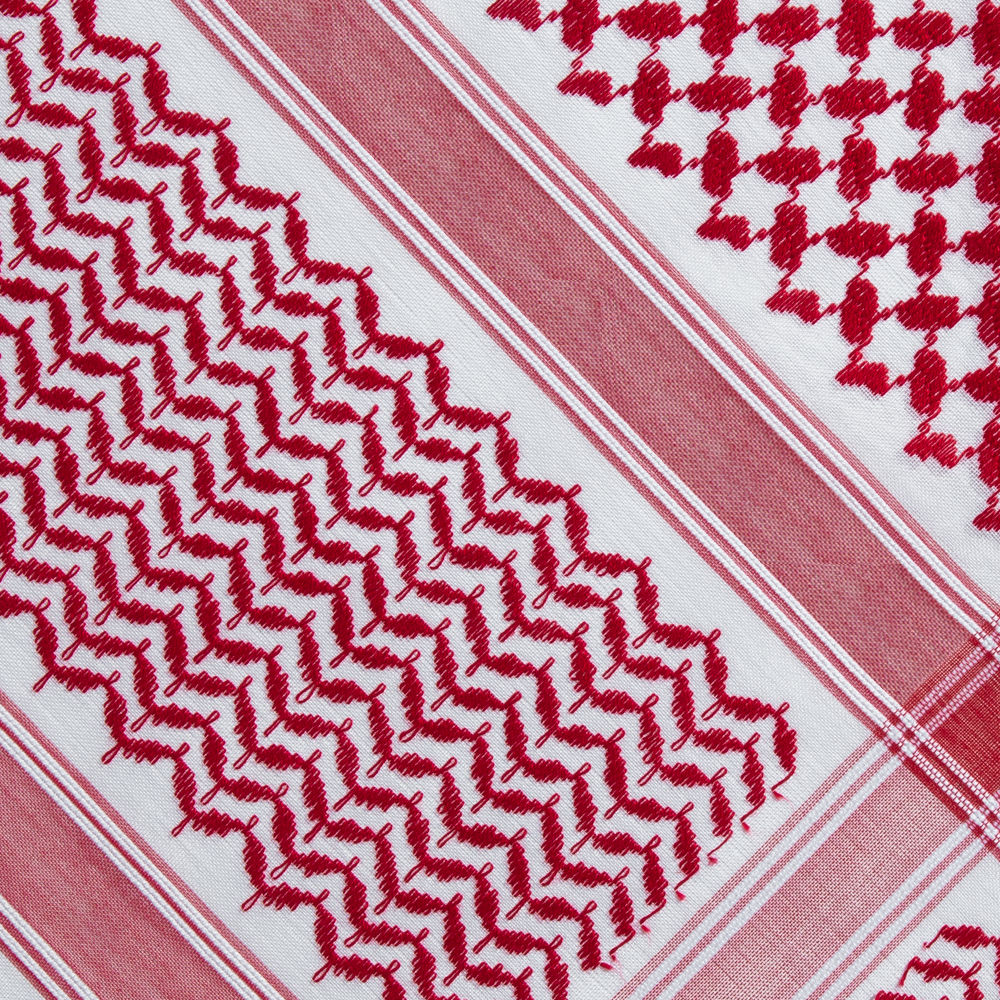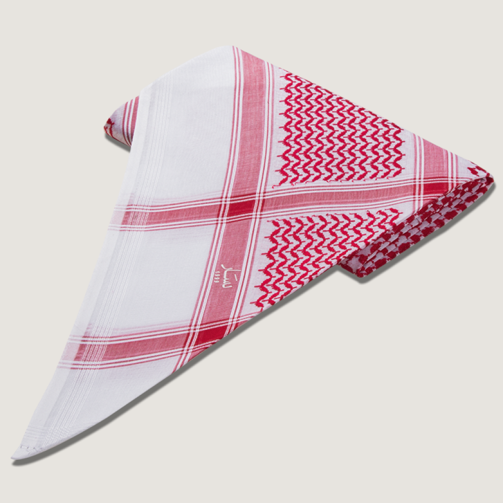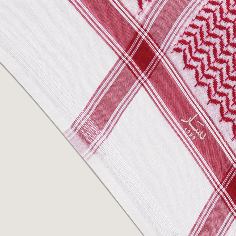 - اللون: اللون الأبيض الناصع مع نقشات حمراء كلاسيكية واضحة وعميقة تمنح الشماغ طابعًا مميزًا وفاخرًا.
