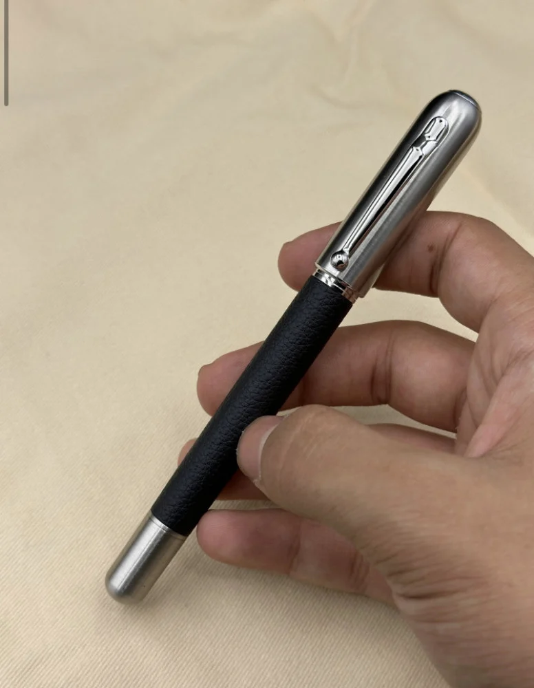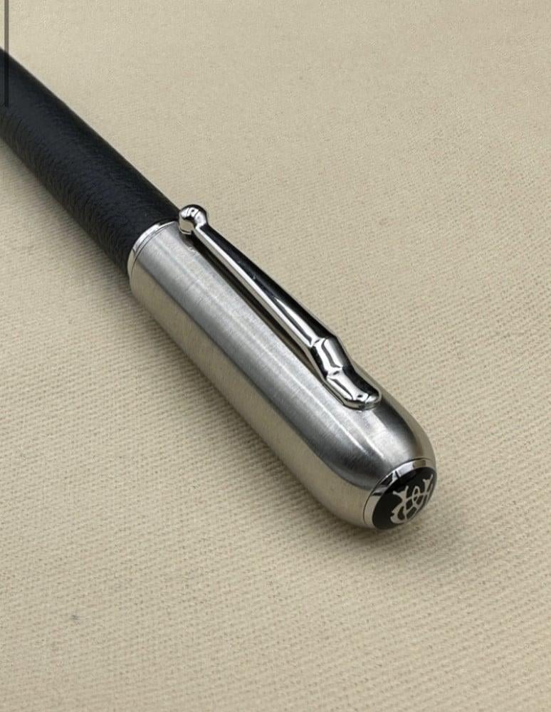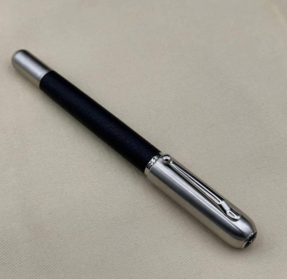 - جسم القلم مغلف بجلد أسود فاخر ولمسة معدنية فضية غير لامعة.
