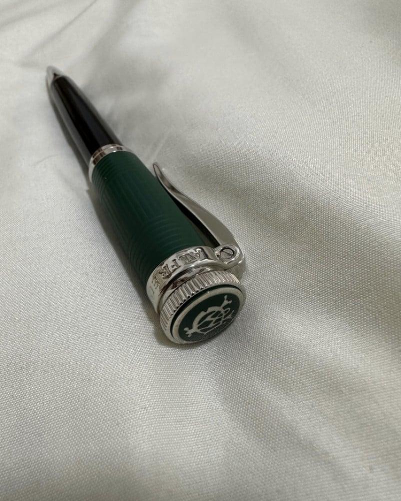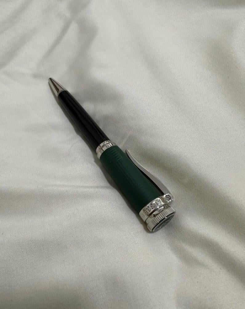 - جسم القلم مزيج من اللون الأخضر الغامق والأسود بلمسات معدنية فضية لامعة.