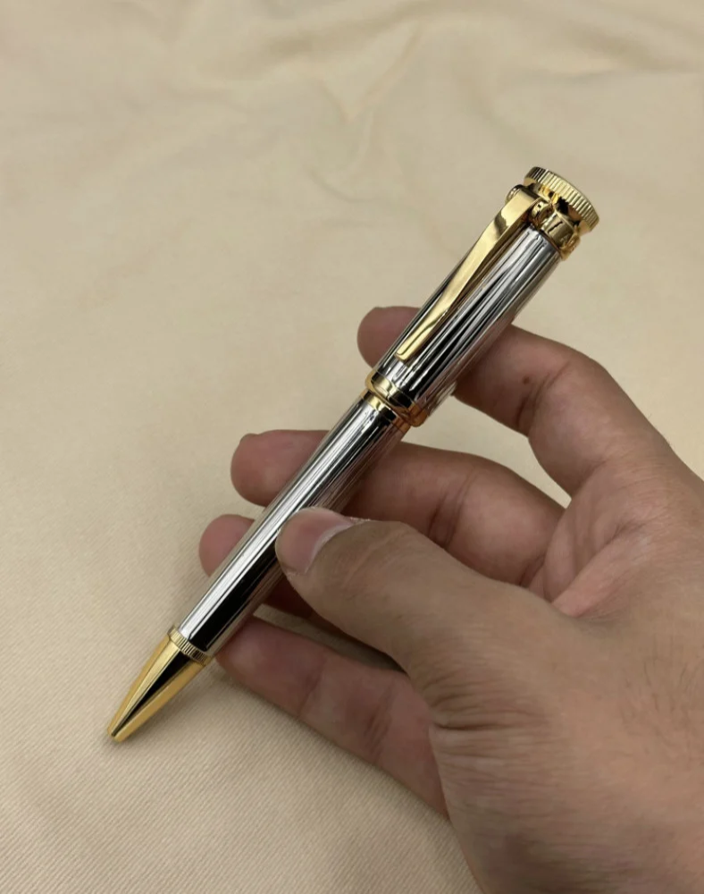 - جسم فضي لامع محزز بخطوط طولية تعكس الضوء بأناقة.