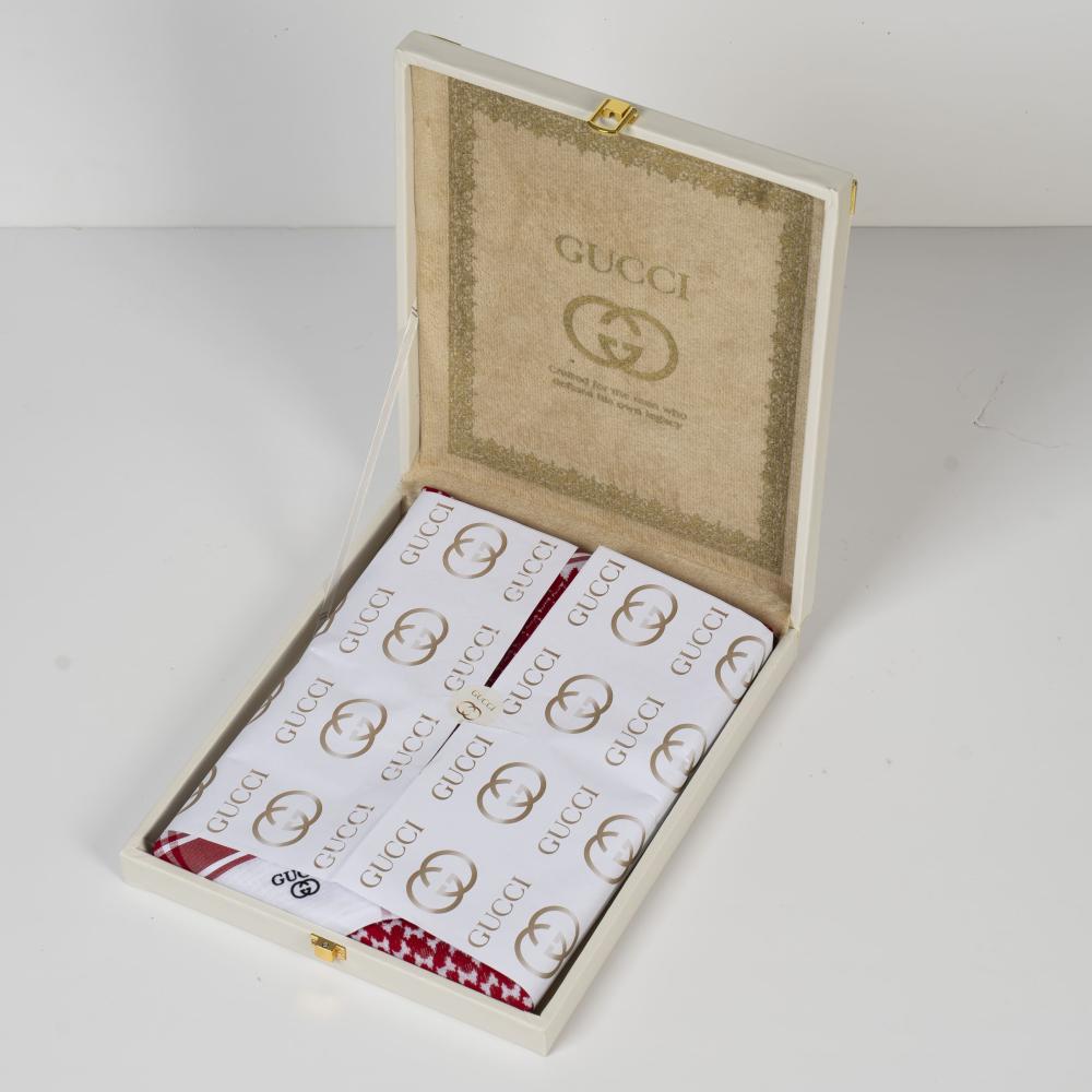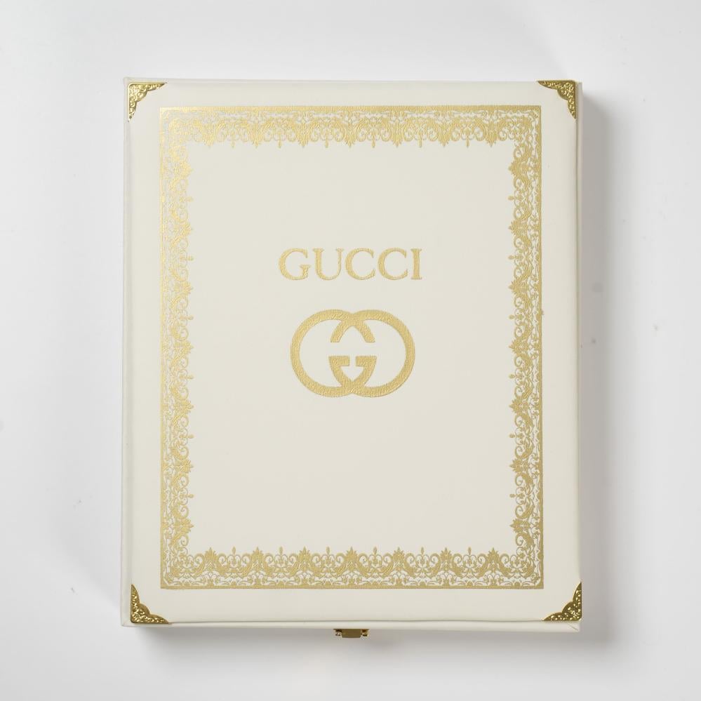 - العلبة: علبة جلد فاخرة باللون الأبيض مع شعار Gucci باللون الذهبي