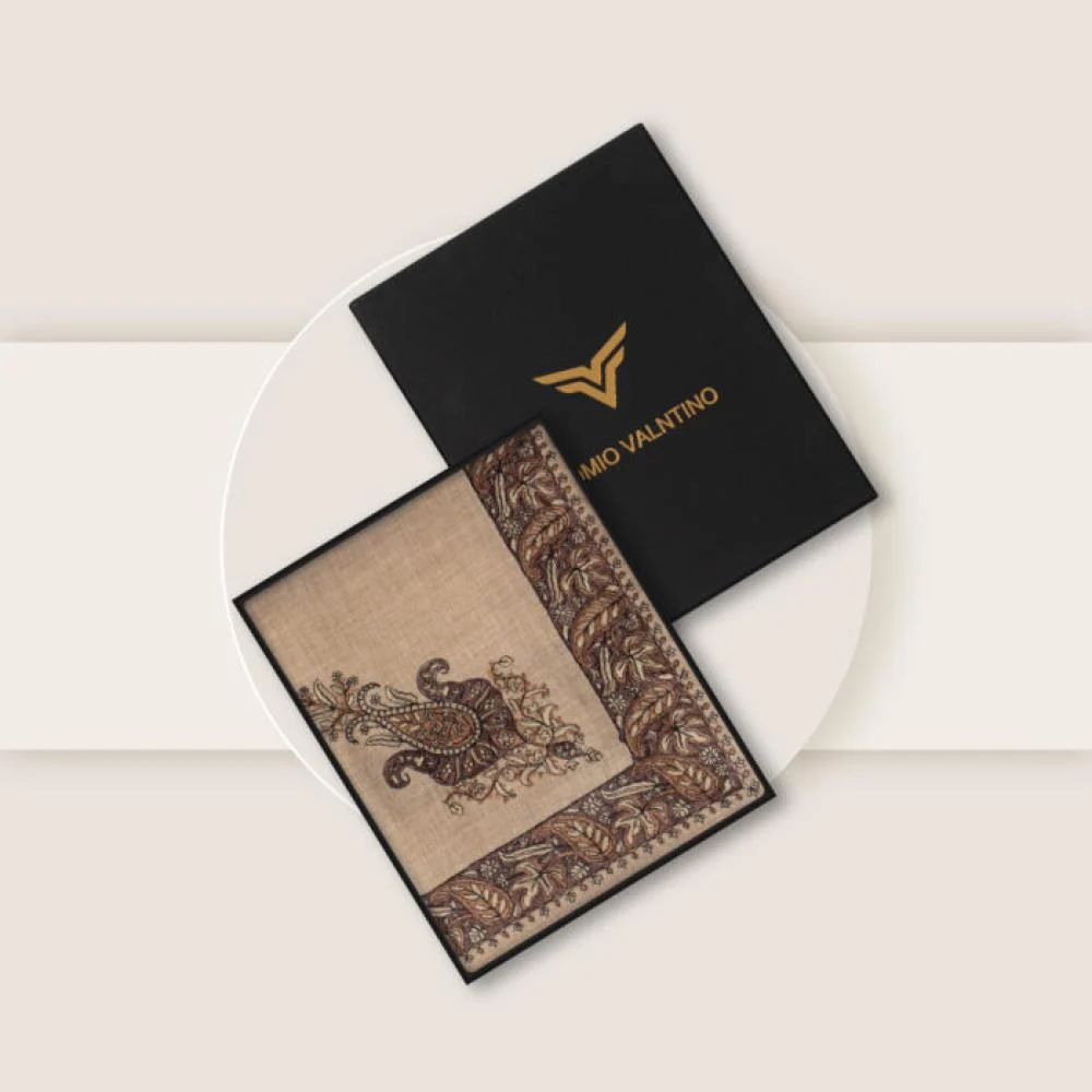 شال كشميري ماركة روميو فلنتينو بيج مطرز بني هو رمز الأناقة والدفء معًا. مصنوع من أجود أنواع الصوف الكشميري الفاخر، هذا الشال يمنحك شعورًا بالراحة الفائقة والنعومة التي تدوم طويلاً. تصميمه المميز بتطريز دقيق على الأطراف يبرز الذوق الراقي.