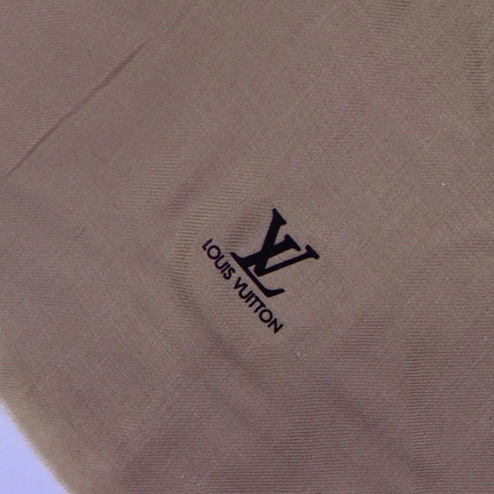 شال كشمري لويس فيتون لون بيج سادة بلونه السكري الراقي وتطريزه الأزرق الفاخر الذي يبرز الحرفية العالية والتفاصيل الدقيقة. مصنوع من صوف الكشمير ليمنحك دفئاً فاخراً وجودة فخمة تدوم طويلاً.