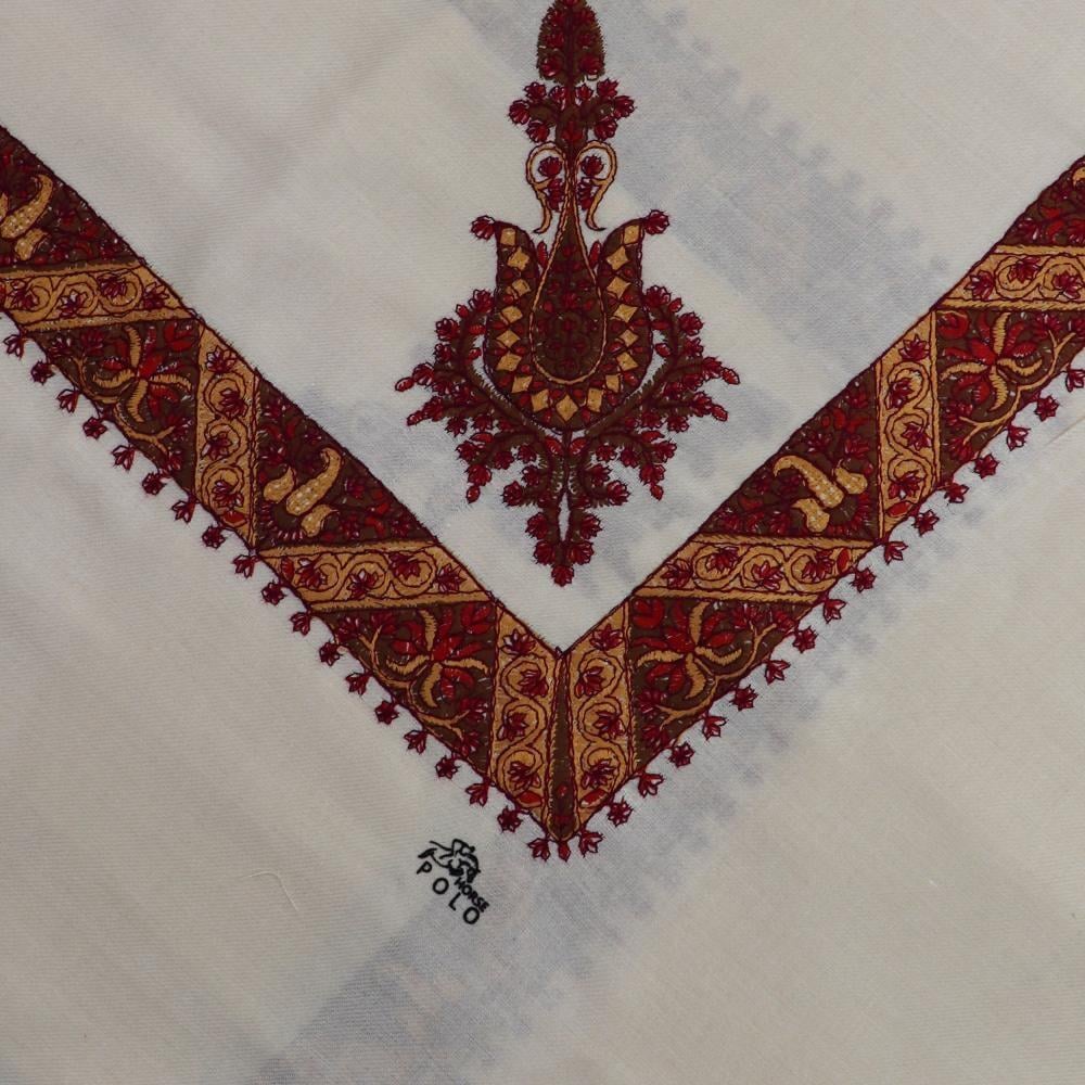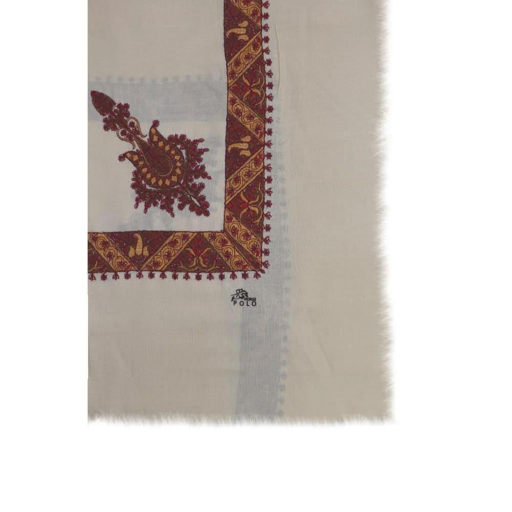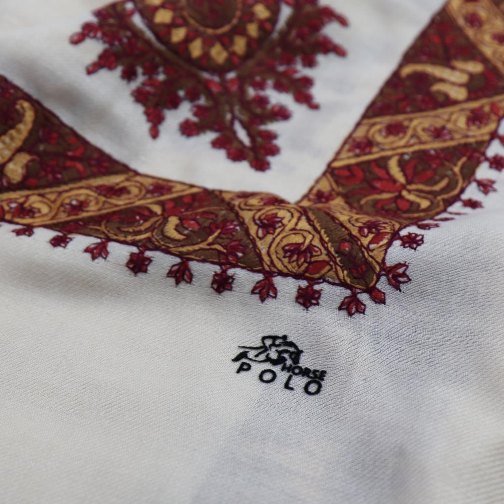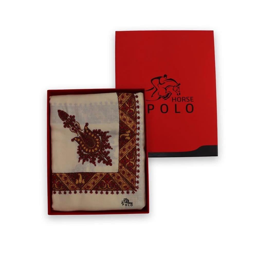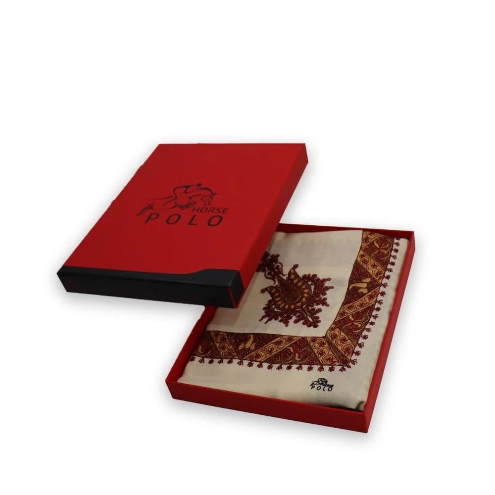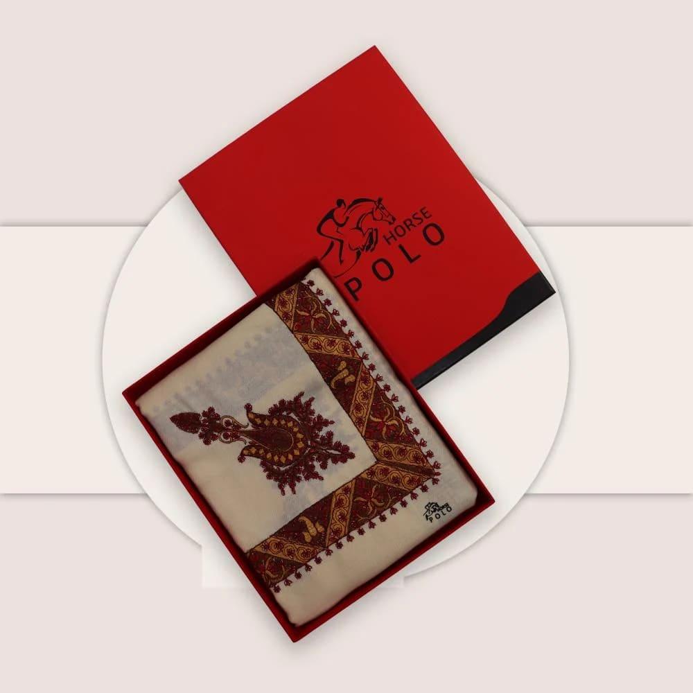 الشال الكشميري المطرز هو قطعة أزياء فاخرة تتميز بدفئها الفائق وحرفيتها العالية. هذا الشال، تحديداً من ماركة "بولو"، يأتي بلون كريمي هادئ ومزين بتطريزات دقيقة باللون الأحمر الداكن، مما يجعله إضافة أنيقة ومميزة لمظهرك في المواسم الباردة.