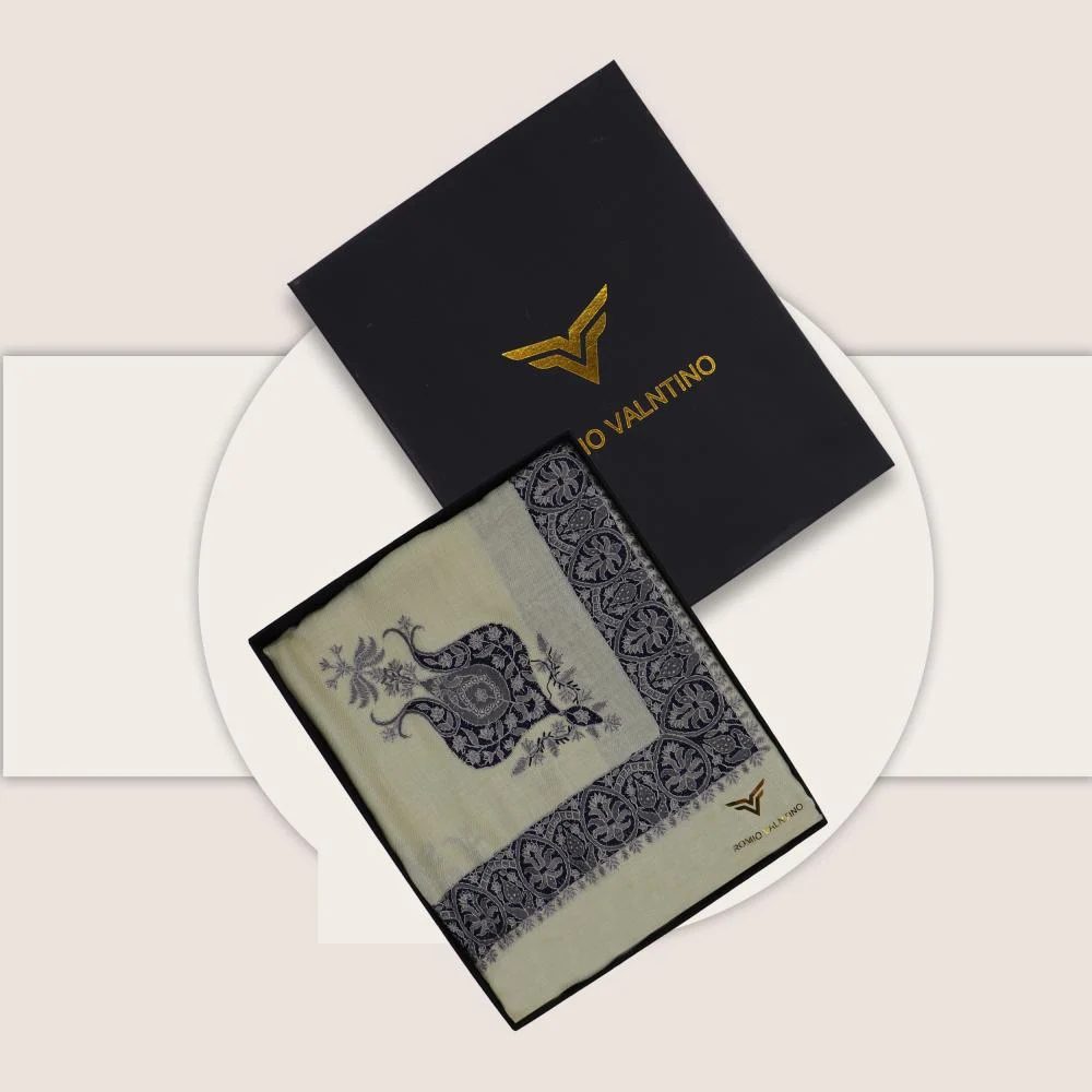 شال كشميري ماركة روميو فلنتينو بيج فاتح مطرز فضي و كحلي، المصنوع بدقة من صوف كشمير الطبيعي الفاخر، بلون بيج هادئ ينسجم مع تطريز يدوي ملكي باللون الفضي و الكحلي الغني. تصميم شرقي فاخر يجمع بين التراث والحداثة، ويُضفي على حضورك لمسة راقية لا تُنسى في كل مناسبة.