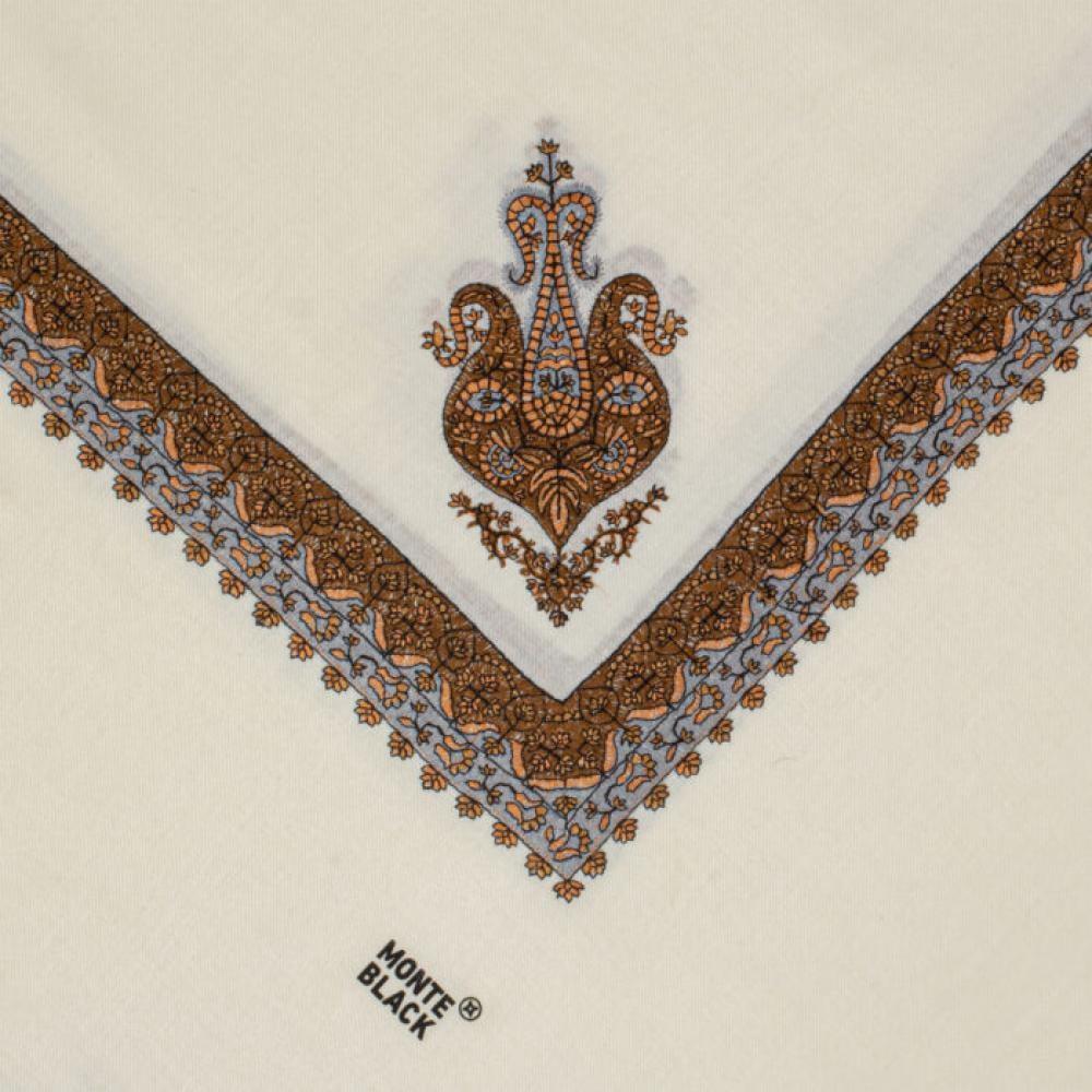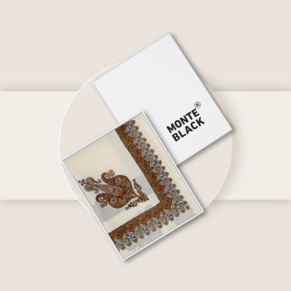 شال كشميري ماركة مونتي بلاك لون ابيض مطرز بني يجسّد المعنى الحقيقي للفخامة الشرقية والتطريز الكشميري العريق. يتميز بتصميمه الراقي وتفاصيله الدقيقة بلون نحاسي فاخر على أرضية بيضاء ناعمة. خامته من الصوف الكشميري الطبيعي تمنحك دفئًا لا مثيل له، ليكون خيارك الأنيق لموسم الشتاء والمناسبات الراقية.