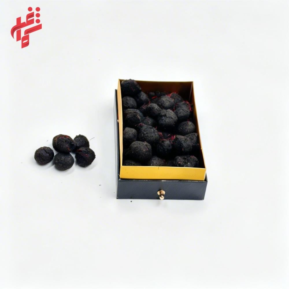 - الشكل: حبات بخور داكنة تزدان بخيوط الزعفران الحمراء (الذهب الأحمر).