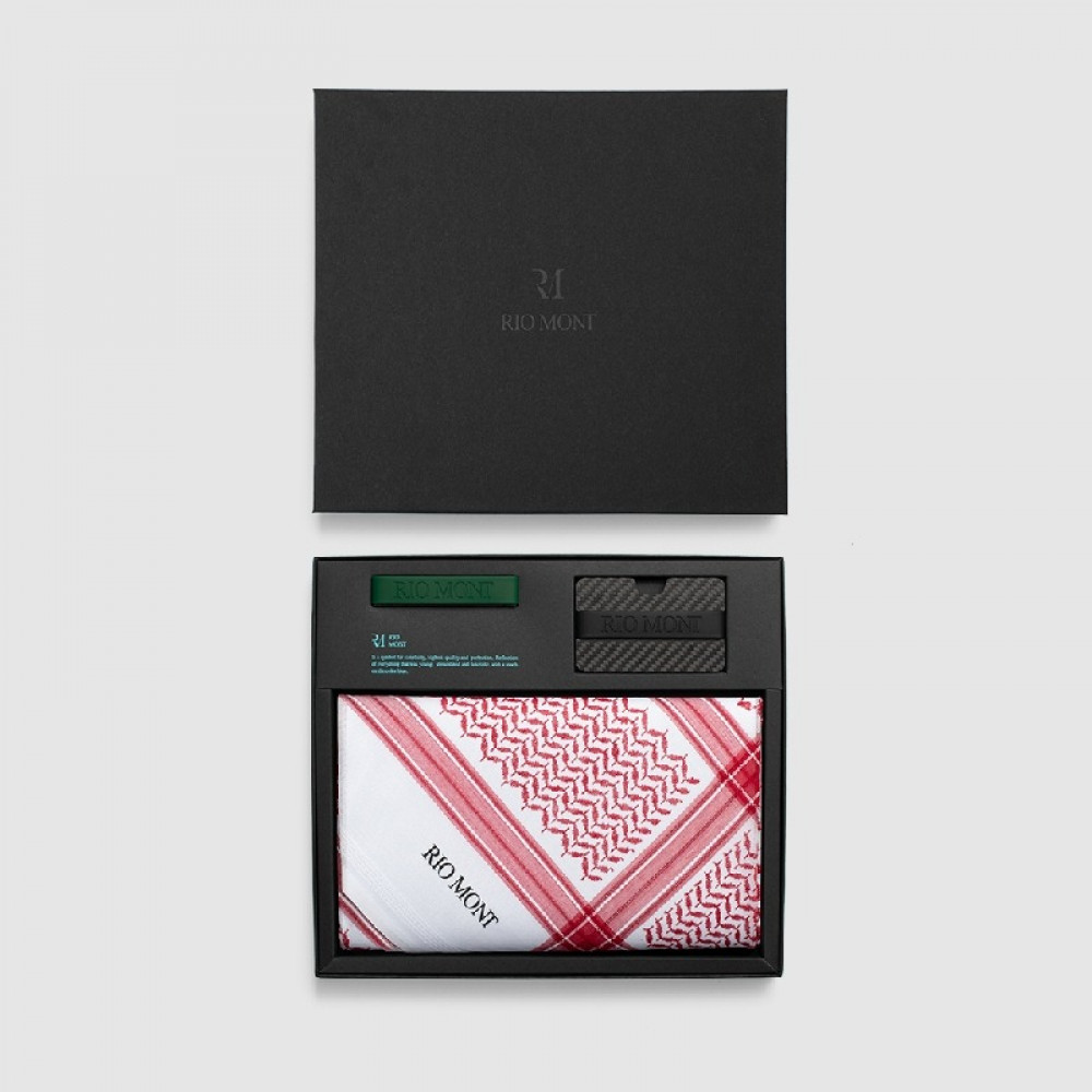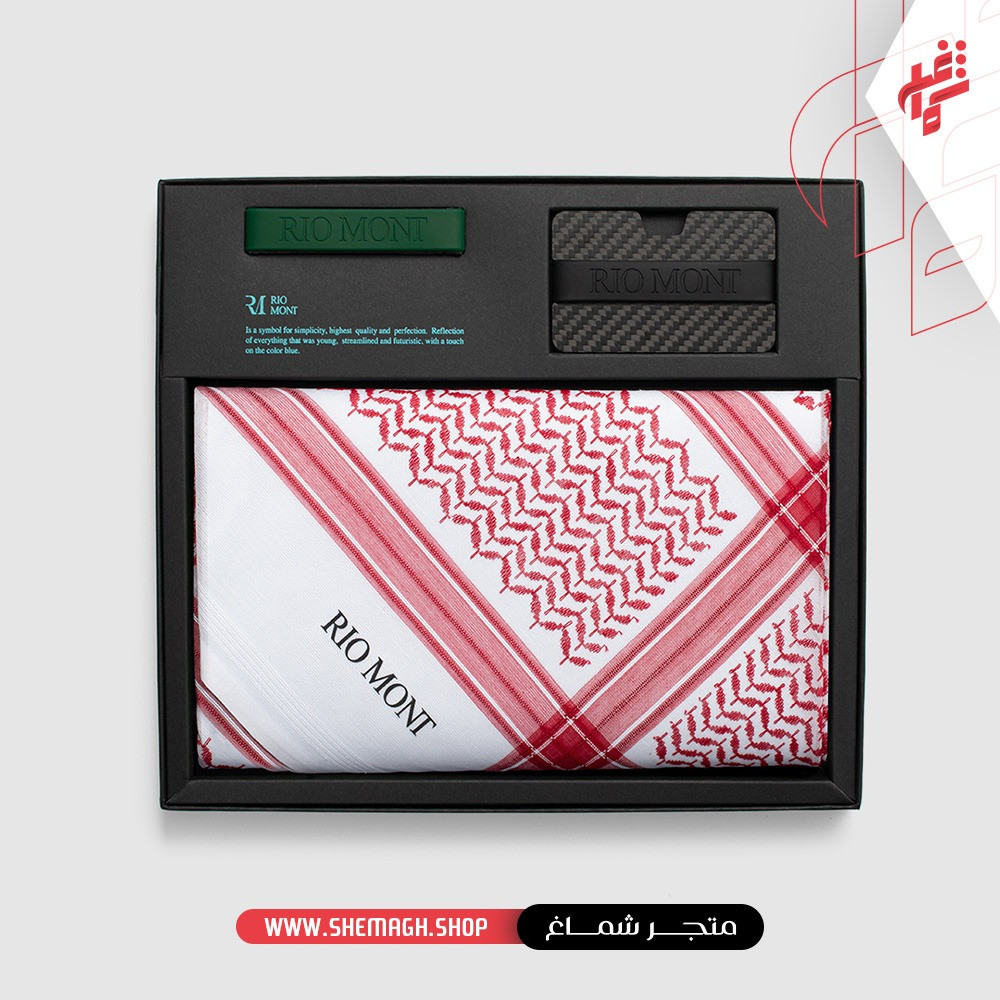 شماغ ريو مون كلاسك احمر مع محفظة كاربون فايبر بحزام أسود أخضر تهتم بأدق التفاصيل حيث تستخدم لتصميم الشماغ آلات متخصصة لإظهار خيوطنا ذات جودة عالية مع لمسة خاصة لنسيج منتجاتنا.