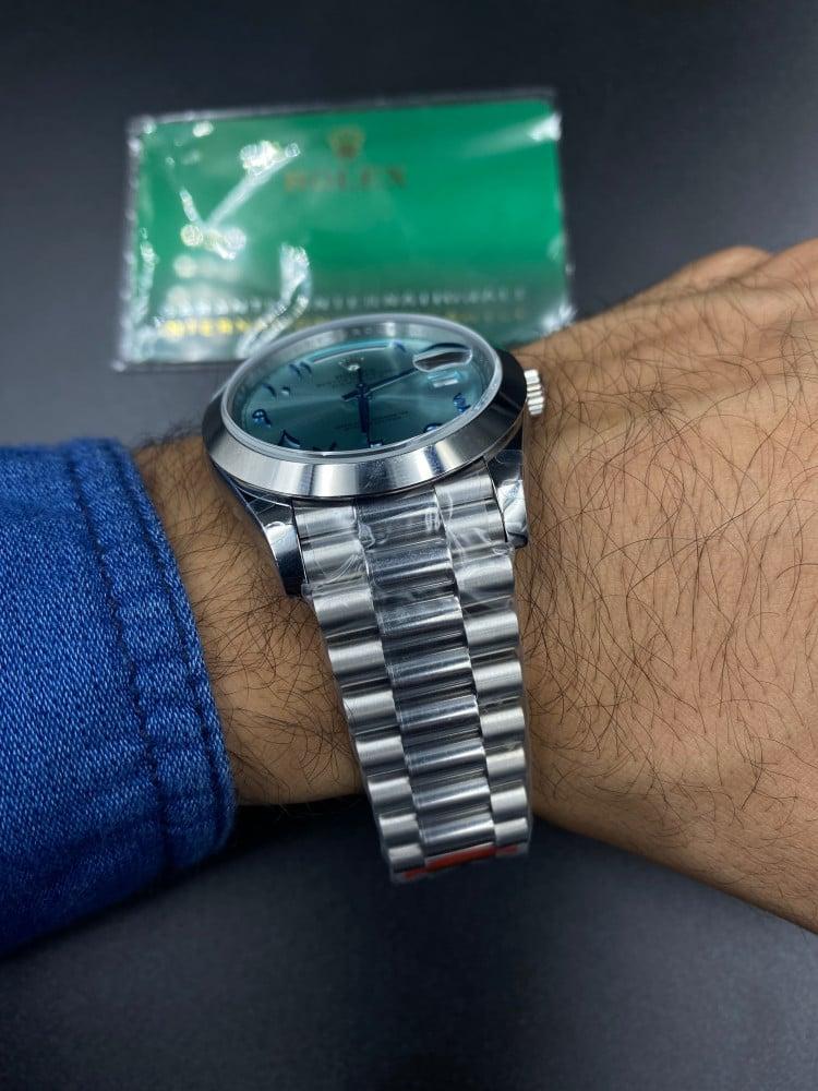 - يكون سوار ساعات رجاليه رولكس معدني فاخر .