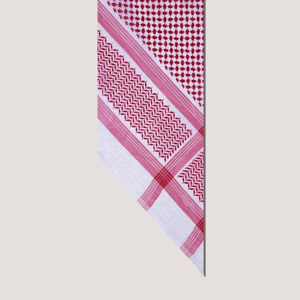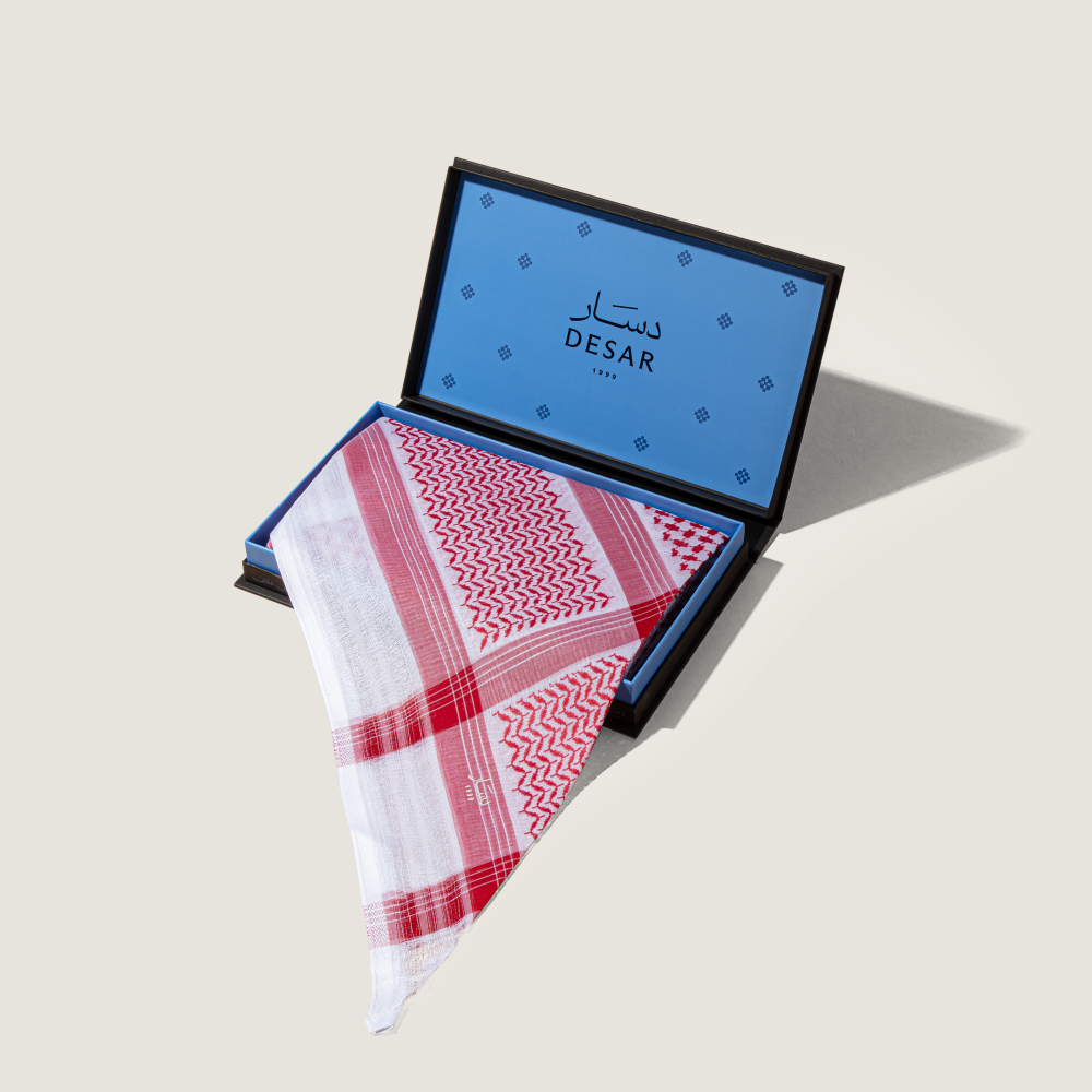 - اللون: أرضية بيضاء بخطوط حمراء موزونة تمنح الشماغ تباينًا بصريًا جذابًا.