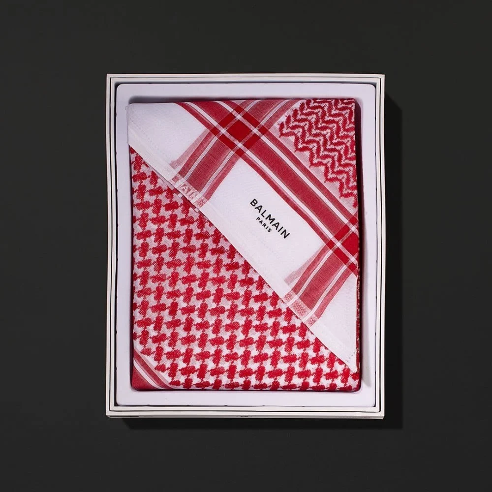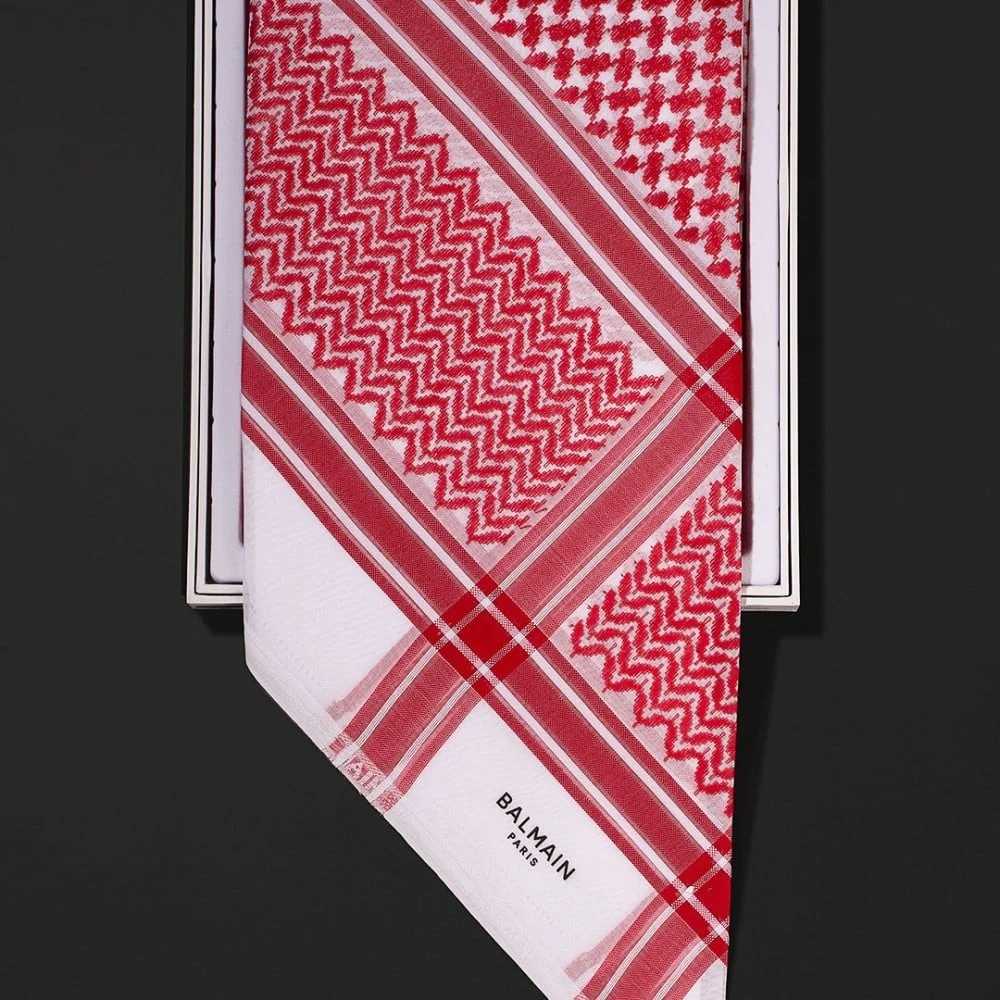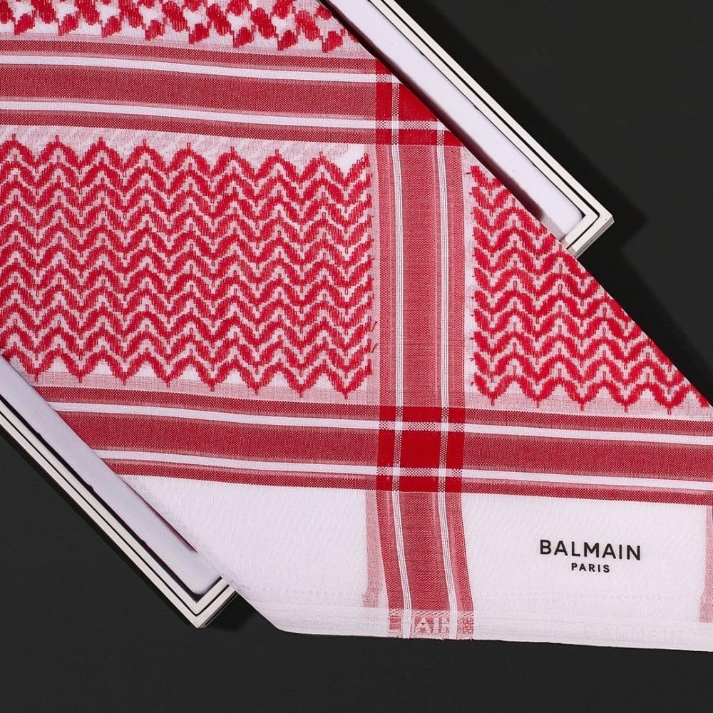 - شعار العلامة: يزدان الشماغ بشعار BALMAIN PARIS المطبوع بدقة على الأطراف، مما يعزز من قيمته كقطعة فاخرة.