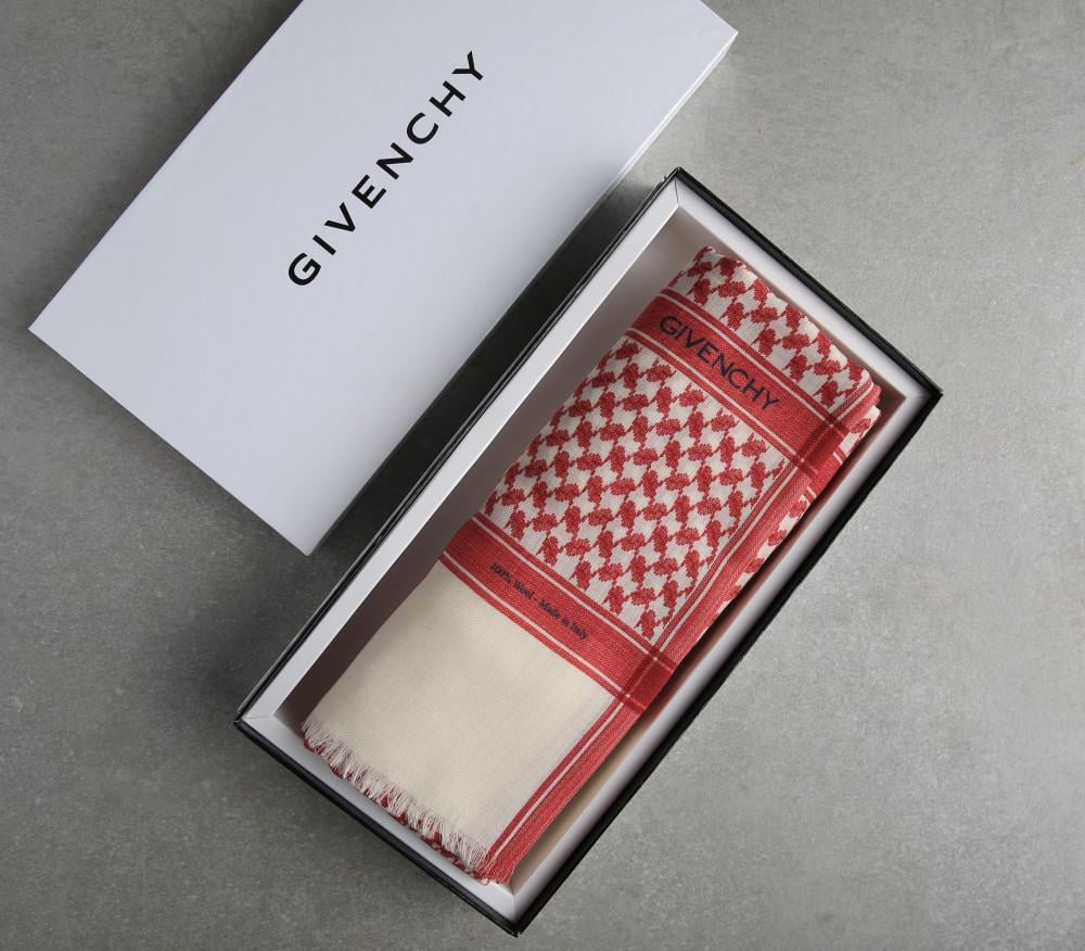 يأتي شال جيفنشي احمر بيج بلونه هادئ مع لمسات بيضاء، لون يرمز إلى الدفء والهدوء والتوازن، ليمنحك أناقة راقية تعكس ثقتك وذوقك.
