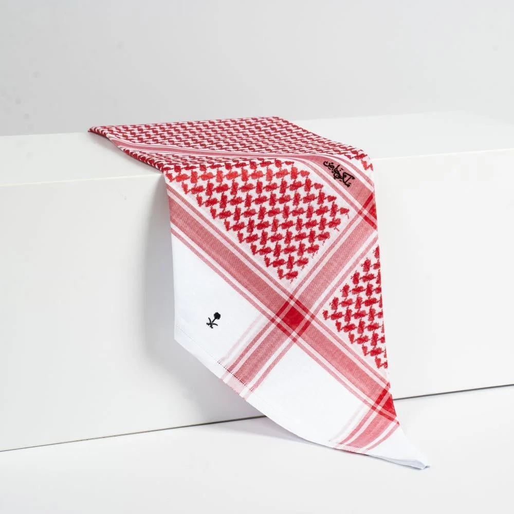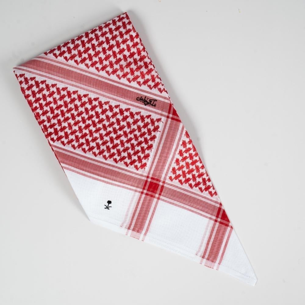 - شماغ احمر يُنتج بتقنيات حديثة تضمن نقشة دقيقة وثبات في اللون والشكل