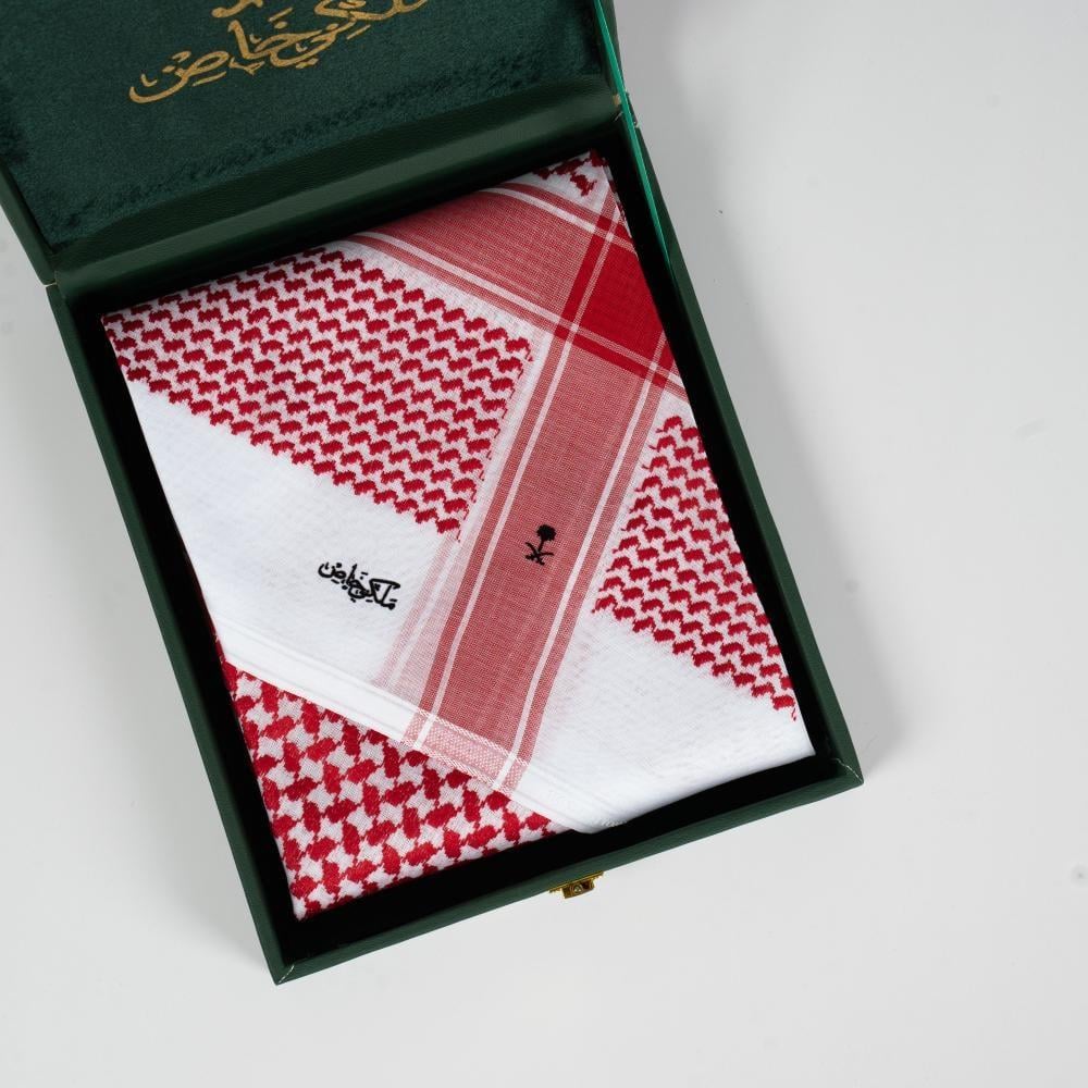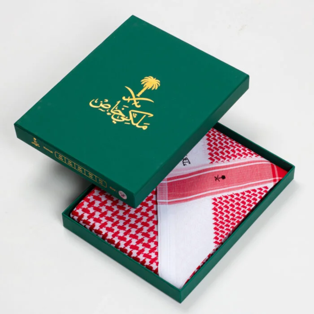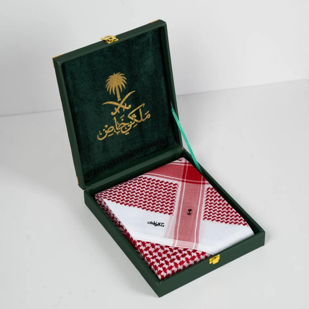 - علبة فاخرة تعكس قيمة الشماغ الملكية.