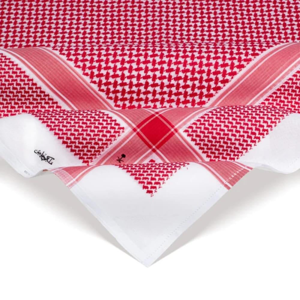 - اللون: شماغ احمر ملكي خاص بدرجة زاهية واضحة، مدموج بنقشة بيضاء تقليدية تزيد من أناقته.